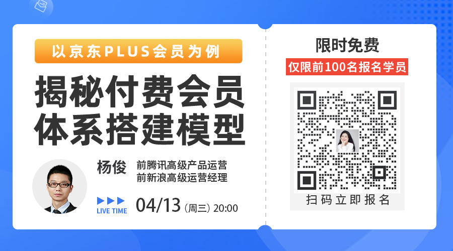 4月13日(周三)晚8点,前腾讯高级产品运营@杨俊老师,将会拆解京东PLUS会员背后的运营增长逻辑,教你会员权益搭建的方法!