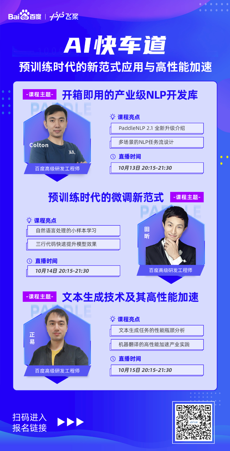 除了重磅发版以外呢,我们还为大家精心准备了配套课程,在10月13-15日,连续三天PaddleNLP技术精讲课程,百度飞桨的明星讲师们历时一个月呕心沥血打磨的三日课,小伙伴们速度扫码报名,快速get PaddleNLP最新技能点!