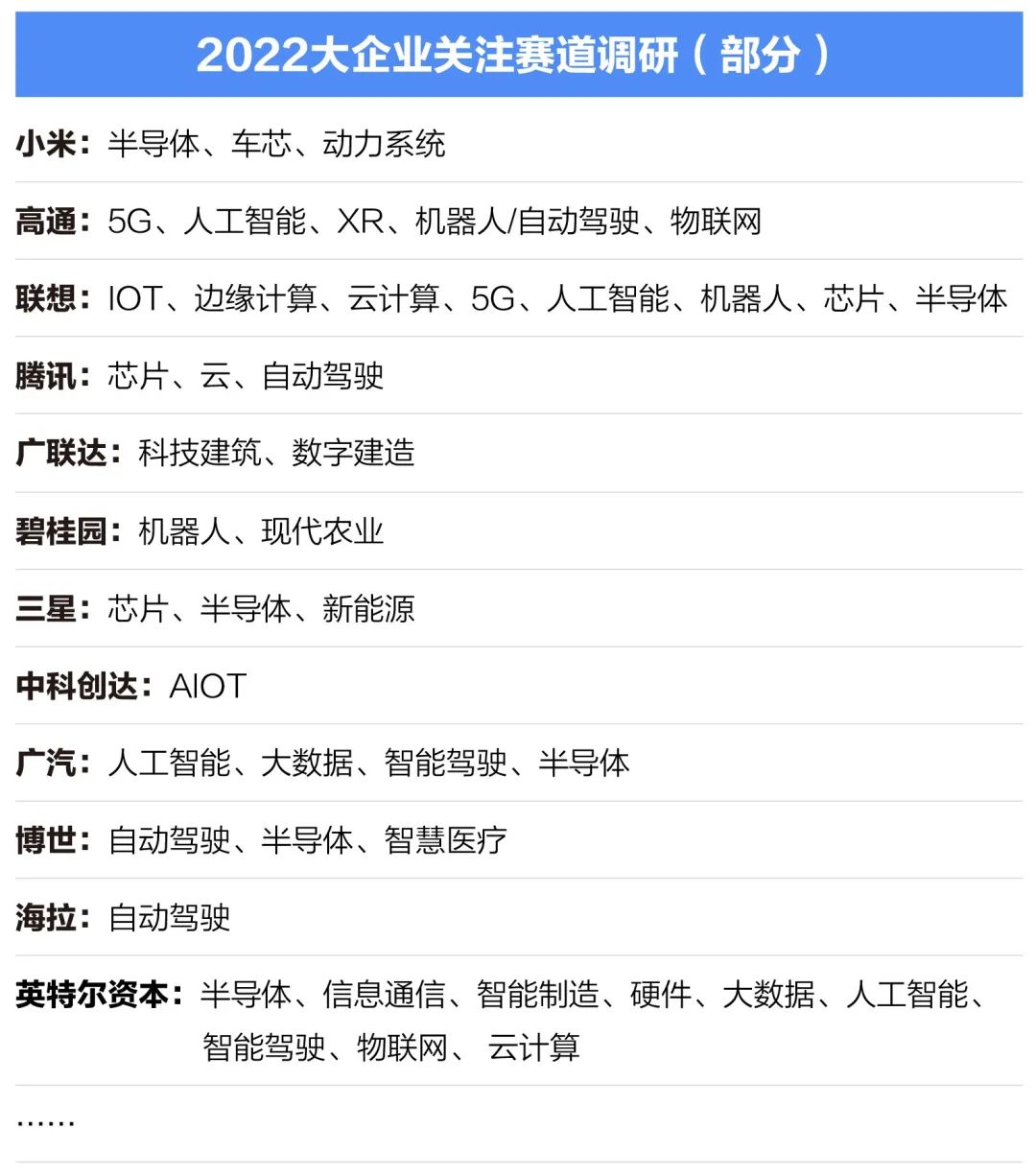 半导体、芯片、人工智能、自动驾驶是大企业持续关注的热门赛道,紧随其后的是智慧建筑、产业互联网、新材料、清洁能源、医疗健康等。