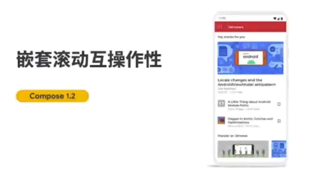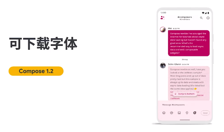作为构建原生 Android 界面的工具包,Jetpack Compose 简化并提升了 Android 界面的开发效率,帮助开发者使用更少的代码、更强的工具和直观的 Kotlin API,快速打造生动而精彩的应用。最近发布的 Jetpack Compose 1.2 稳定版,更是加入了可下载字体、嵌套滚动互操作等新功能。