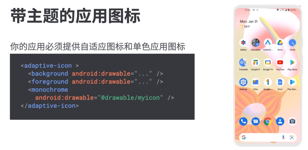 生产力功能的更新。诸如 Android 13 将 Material You 的动态颜色扩展到了所有应用图标,用户可以基于其壁纸和其他主题偏好来选择图标色调。以及,可按应用设定语言偏好的“应用语言”设置面板,更好地满足了多语言用户的需求。