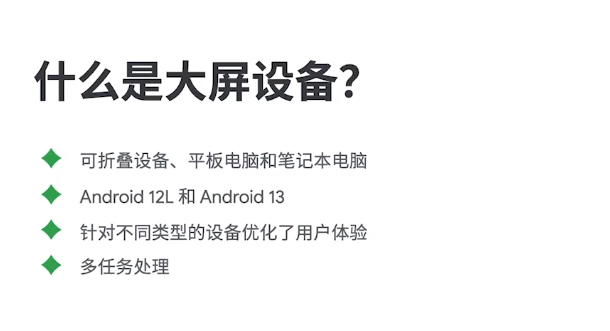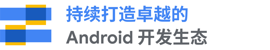 Android 12 L 和 Android 13 针对不同类型的设备优化了用户体验,包括任务栏、多任务、键盘鼠标支持和应用兼容模式等。创建了“大屏幕应用质量指南”和“Material Design 布局规范”,帮助开发者们为大屏幕优化自己的应用。开发者可以建立跨手机、平板电脑、可折叠设备和可穿戴设备的应用,实现单一应用在不同终端均可运行。