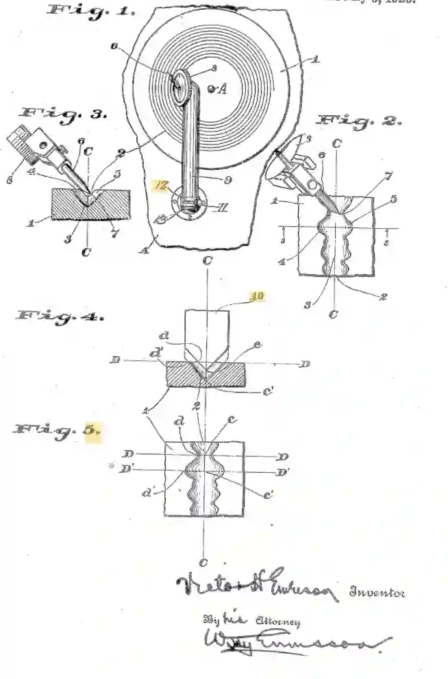 保存声音:录制机器使用各种方法(振膜传递振动等)驱动一个录音头(就相当于一个小刻刀),录音头在平滑的旋转乙烯基盘片上根据声波振动不同左右震动,刻出一道道深浅不一的同心圆凹槽,直接代表连续的声音变化,凹槽左右边的不同波浪就代表了左右声道的声音变化。