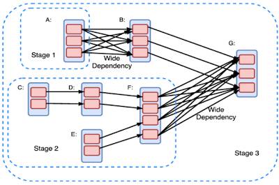 Spark 用户将计算建模为 DAG,该 DAG 表示了在 RDD 上执行的转换和动作。DAG 进而被编译为多个 Stage。每个 Stage 执行为一系列并行运行的任务(Task),每个分区(Partition)对应于一个任务。这里,有限(Narrow)的依赖关系将有利于计算的高效执行,而宽泛(Wide)的依赖关系则会引入瓶颈,因为这样的依赖关系引入了通信密集的 Shuffle 操作,这打断了操作流 。