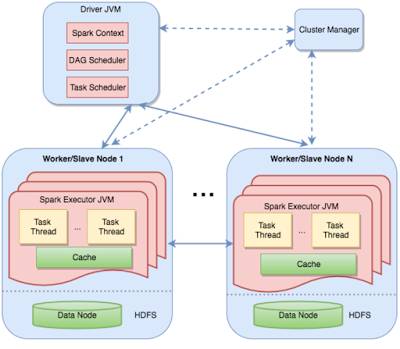 Spark 的分布式执行是通过将 DAG Stage 划分到不同的计算节点实现的。上图清晰地展示了这种“主机(master)- 工作者(worker)”架构。驱动器(Driver)包含有两个调度器(Scheduler)组件,即 DAG 调度器和任务调度器。调度器对工作者分配任务,并协调工作者。