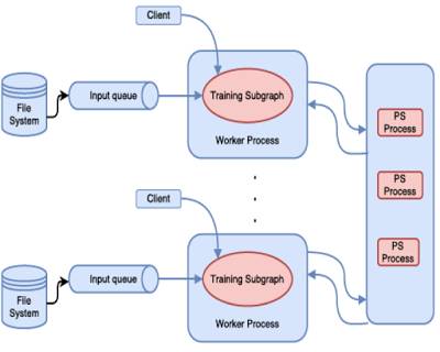 如上图所示,在 TensorFlow 中,分布式机器学习训练使用了参数 - 服务器方法。当在 TensorFlow 中使用 PS 抽象时,就使用了参数 - 服务器和数据并行。TensorFlow 声称可以完成更复杂的任务,但是这需要用户编写代码以通向那些未探索的领域。