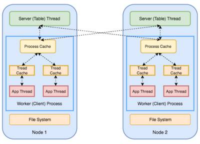 PS(在图中以绿色方框所示)以分布式 key-value 数据表形式存在于内存中,它是可复制和分片的。每个节点(node)都是模型中某个分片的主节点(参数空间),并作为其它分片的二级节点或复制节点。这样 PS 在节点数量上的扩展性很好。