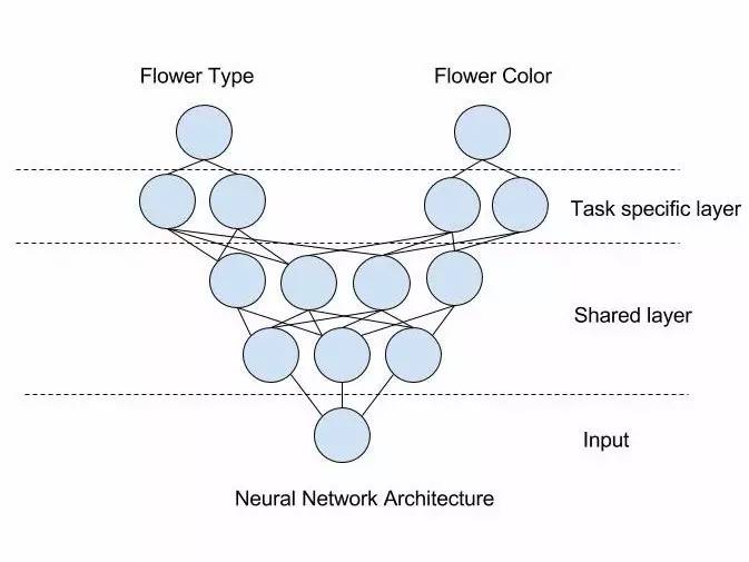 在上图中,隐藏的节点称为“共享层”,因为这些层的重要性对于这两个任务是相同的。然后,我们有“任务特定层”,其中分别执行与每个任务相关的计算,而不在层之间共享参数。在这些任务特定的层中,特定的神经网络学习特定任务的信息。这些独立任务层中的每一个节点都有不同的输出。在此例子中,一个节点预测花朵为玫瑰或雏菊,另一个预测花的颜色是红色、粉红色或白色。