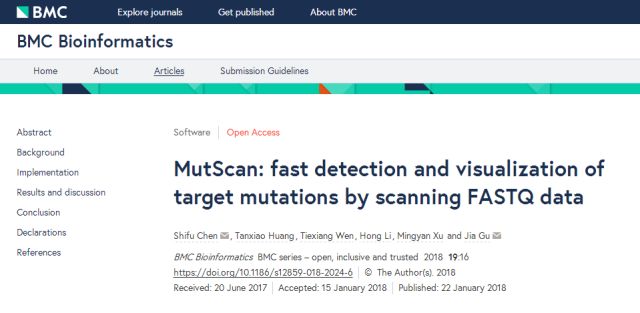 Shifu Chen et al, MutScan: fast detection and visualization of target mutations by scanning FASTQ data. BMC Bioinformatics.