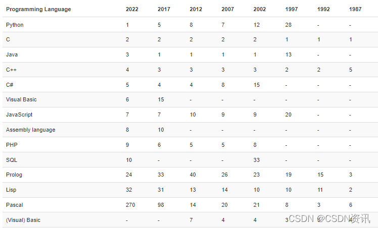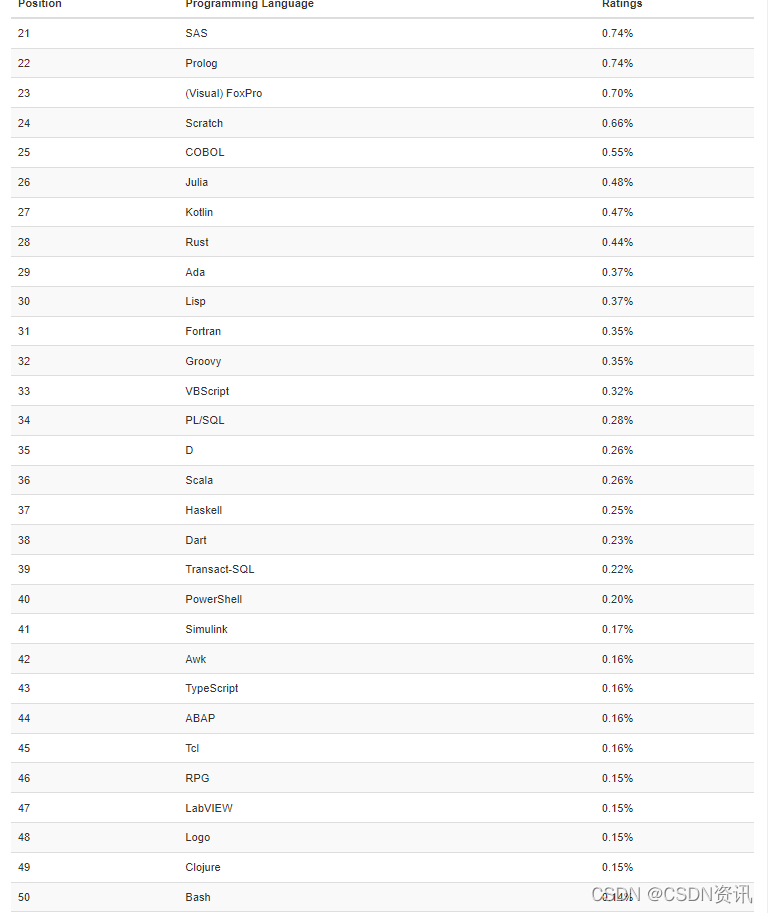 以下语言列表表示#51 到#100。由于差异相对较小,下面的编程语言按字母顺序显示: