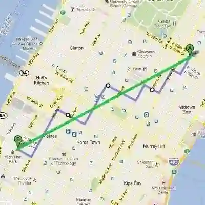我们已经习惯了用一种方法定义距离,常常会忽视其他方式。通常,我们用“欧几里得距离”测量距离,即在两点之间测量直线的距离。但在有些情况下,这样的测量方式就说不通了。例如在街道网格中,就需要用到“曼哈顿距离”了,直线距离5英里的目的地,可能需要走3英里之后转90°,再继续走4英里才能到达。