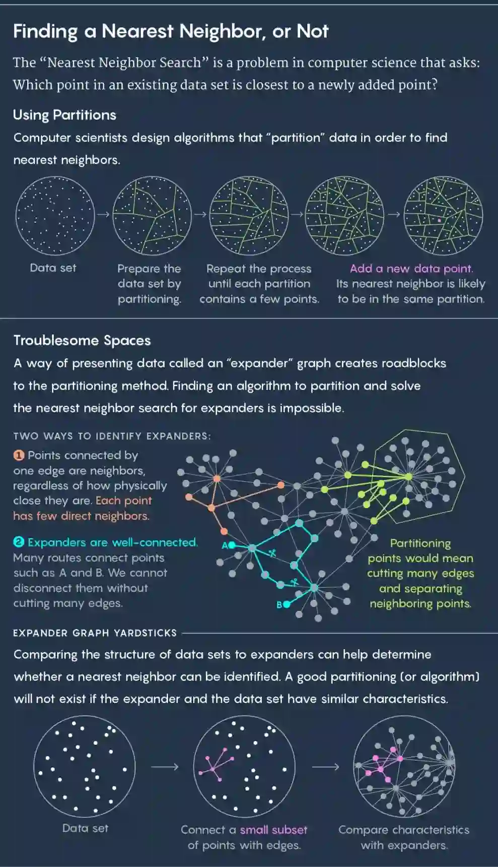 他们想原因可能与在寻找最近邻时复杂的“扩展图(expander graph)”有关。扩展图是一群由线条连接起来的点。这些图都有它们自己的距离尺度,图中两点之间的距离是你从一点到另一点所经过的最少线段。可以将其想象成社交网络中的各种人脉关系。