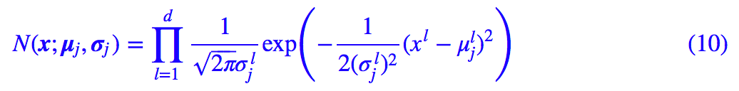一个较为简单的模型是假设协方差矩阵是一个对角阵 Σj=diagσj,σj 是类别 j 的方差向量,其中表示该向量的第 l 个分量。这样相当于将 x 的各个分量解耦了,认为各个分量是独立的,(2) 式就变为: