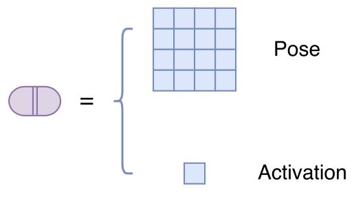 既然 Capsule 的模长已经没法衡量特征的显著性了,那么就只好多加一个标量 a 来作为该 Capsule 的显著性。所以,这篇论文中的 Capsule,实际上是“一个矩阵 + 一个标量”,这个标量被论文称为“激活值”,如图: