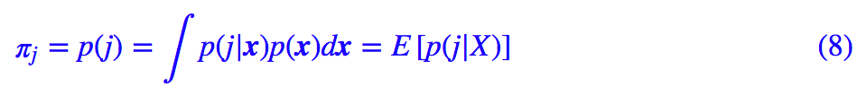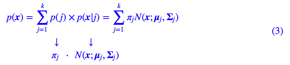 其中 j 代表了类别,取值为 1,2,…,k,由于 p(j) 跟 x 没关系,因此可以认为它是个常数分布,记 p(j)=πj。然后 p(x|j) 就是这个类内的概率分布,GMM 的特性就是用概率分布来描述一个类。