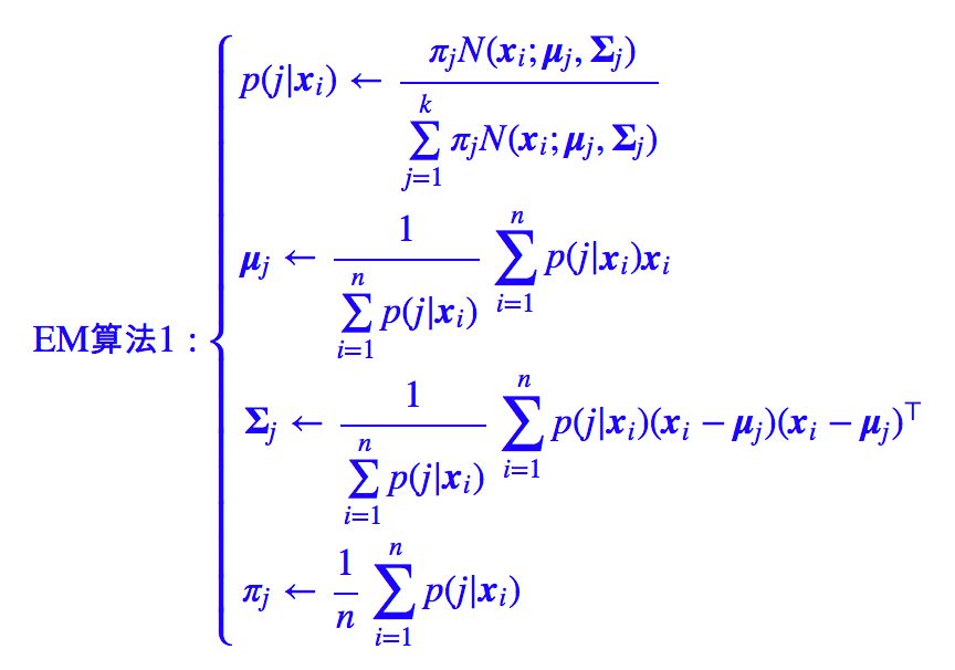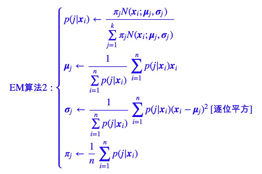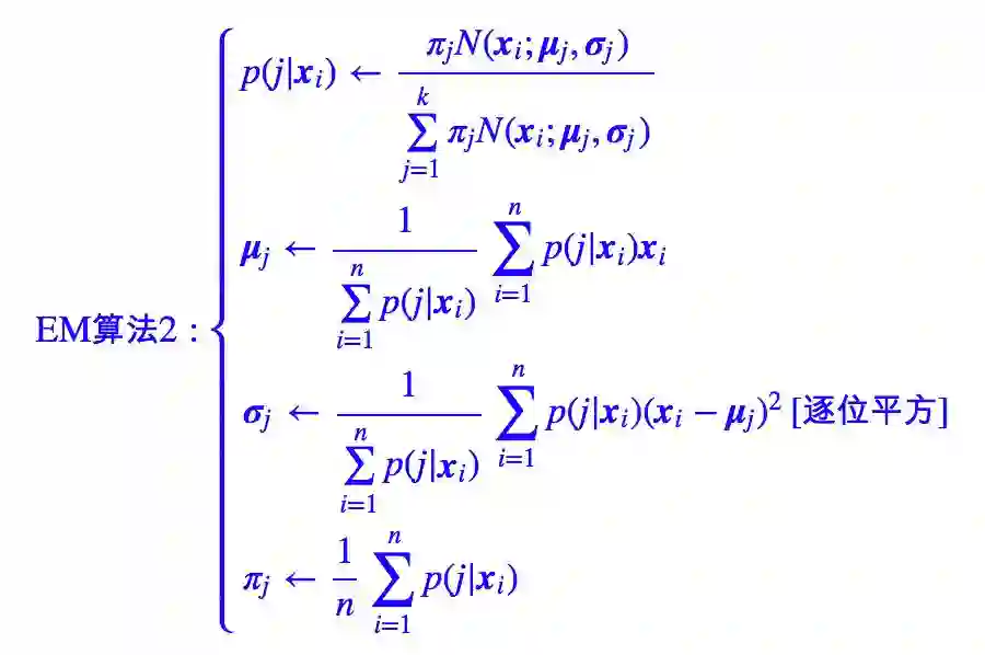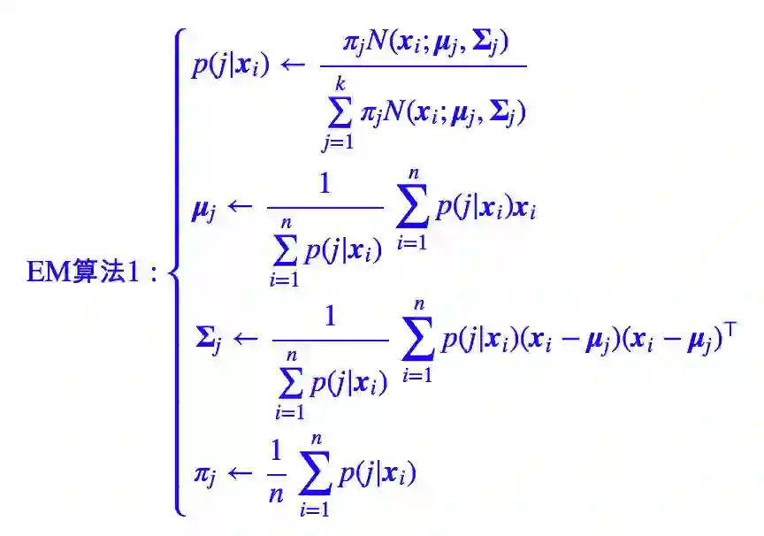 其中为了突出加权平均的特点,上述迭代过程先将 (9) 式作了恒等变换然后代入 (6),(7) 式。在上述迭代过程中,第一式称为 E 步,后三式称为 M 步,整个算法就叫做 EM 算法。