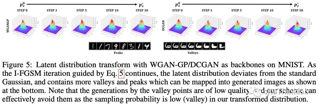 本文指出,现有GAN模型在生成过程(测试过程)和模型训练过程中使用的隐空间分布存在可优化的空间,继而提出对原始隐空间分布施加采样变换以优化该分布。在图像生成场景下,在隐变量上的扰动将造成生成图像上的细节差异,然而图像上的细节差异即可造成生成上的失真,因此我们希望通过对隐变量施加扰动来获取生成质量(实现上量化为判别器网络输出)的显著提升。鉴于任务的相似性,这一采样变换在实现上通过对抗样本方法完成,具体而言,我们通过对隐变量 采用I-FGSM方法[5]进行迭代以最小化生成器损失即 。将特定的隐空间变换引入GAN训练过程中将缓解训练困难以提升生成器映射的质量,而在生成过程中引入隐空间采样变换能够直接提升采样质量以获得更真实的生成。