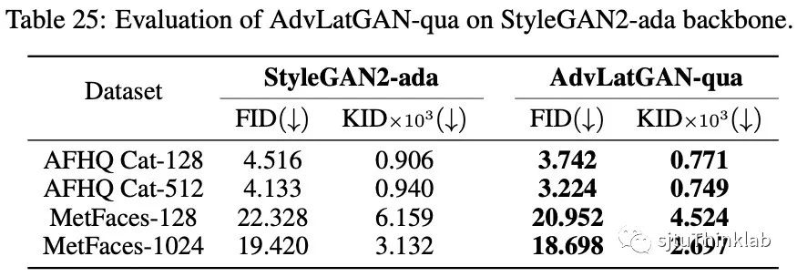 上表展示了AdvLatGAN-qua(+)/div(+)在八种主流GAN模型上的有效性,验证的数据集包括Cifar-10、STL-10、LSUN、CelebA、ImageNet、AFHQ以及MetFaces,在数值结果上,我们的方法在各种场景下均存在显著提升,提升幅度最高达到50%。