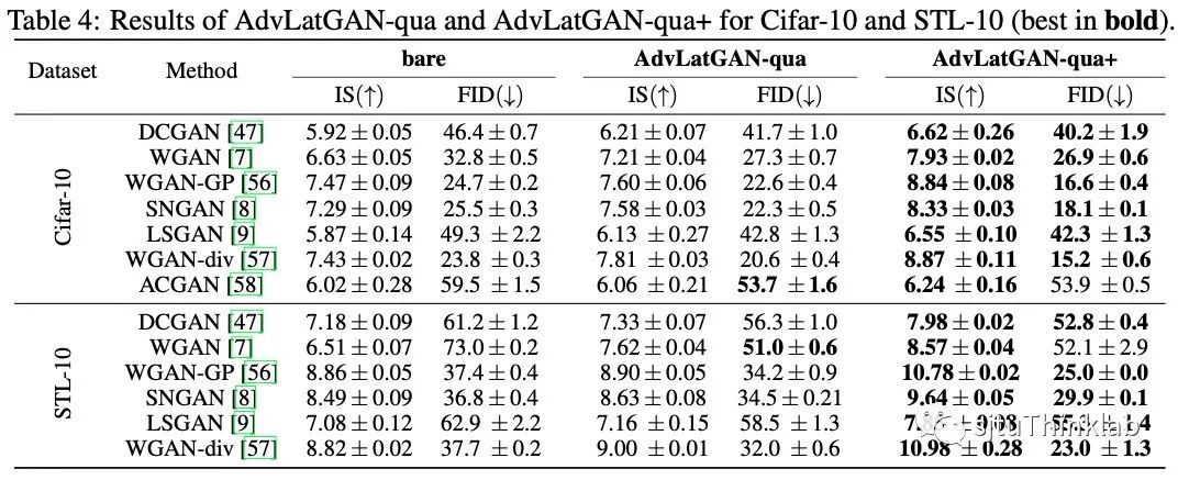上表对比了其他GAN采样优化方法在不同GAN算法上的表现,AdvLatGAN-z显示出明显的优势。