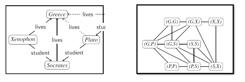 作者首先定义了节点表示图,节点表示图是由KG编码而来,KG中的节点表示实体,边表示关系。而在节点表示图中,每个节点表示一个实体对,在原图中,如果存在一个节点或者两个节点之间存在一条边,那么在节点表示图中会有一个节点,如(Plato,lives,Greece)会有三个节点,并且每个节点会生成一个向量表示,向量的维度为关系数量的2倍。用来表示两个节点之间存在何种关系,同样以(Plato,lives,Greece)为例,编码在图中的节点为(G,S),(G,G),(S,S)。作者规定节点对的编码是以两个单词的字典序作为前后顺序,也就是说一个节点对仅存在唯一的节点表示。对于(G,S)节点来说,其向量表示为(0,1,0,0)。因为图中有两个关系lives和student,因此表示向量的维度为4。第一个零表示不存在(Greece,lives,Plato)这样的关系,因此编码为0;同理存在(Plato,lives,Greece)这样的关系,因此编码为1。后面两个依次表示不存在(Greece,student,Plato),(Plato,student,Greece)这样的关系。