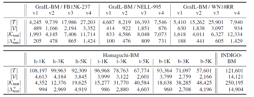 GraIL-BM共有12个数据集,分别由FB15K-237,NELL-995和WN18RR随机采样一些实体作为种子,然后取周围的k-hop邻域的并集得来。