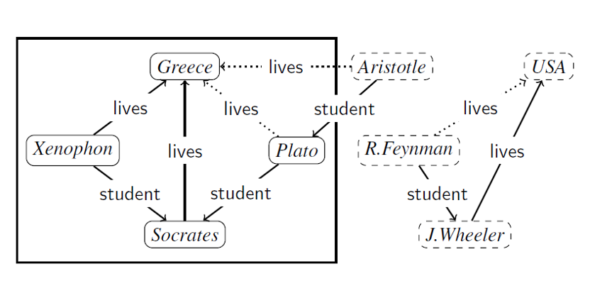 而在实际应用中,KG通常是在变化的,因此很容易出现在训练过程中并未见过的实体,会使得效果很差。例如在图中,实线部分是训练集,虚线部分是测试集。对于(Plato, lives, Greece)这一三元组,因为Plato,lives,Greece这三个向量都在训练过程中进行了反向传播得到了合理的向量表示,因此在链路预测的过程中很容易预测成功。但是对于(Aristotle, student, Plato), (R.Feynman, student, J.Wheeler),(J.Wheeler, lives, USA)这三个三元组,因为在训练过程中并未出现,因此它们的向量仅仅是随机初始化的向量表示,此时采用基于嵌入的方法,几乎不可能找到正确的预测结果。因此文中将这种基于嵌入的方法称为transductive mothed。例如TransE,RotatE。