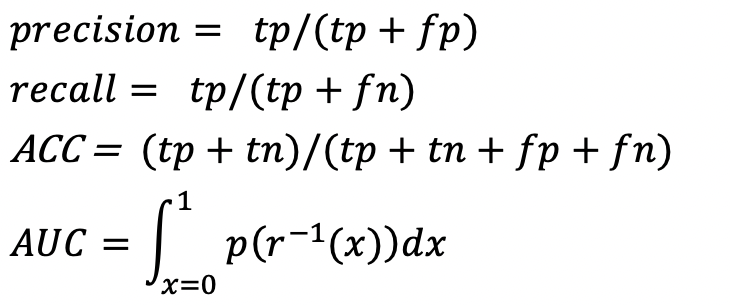 评估指标包含:precision,recall,ACC,AUC,e-Hits和r-Hits。定义如下: