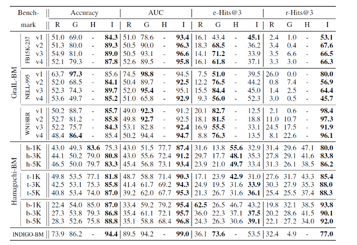 GraiL模型提出了12个benchmark,Ham模型提出了9个benchmark。再加上作者提出的一个benchmark,一共有22个数据集。可以看到在ACC上模型在19个数据集上达到了SOTA,在AUC上模型在18个数据集上达到了SOTA,对于实体命中率,模型效果比较差,仅5个数据集上达到了SOTA。关系命中率模型效果很好在所有的数据集上都达到了SOTA。作者认为传统的的GCN模型在负采样的过程中随机替换了实体,这会被认为是对于正确实体的“偏见”。INDIGO的抽样策略中不存在这种“偏见”,因此导致了训练性能的降低。