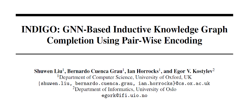 论文引用:Liu S, Grau B, Horrocks I, et al. INDIGO: GNN-based inductive knowledge graph completion using pair-wise encoding[J]. Advances in Neural Information Processing Systems, 2021, 34.