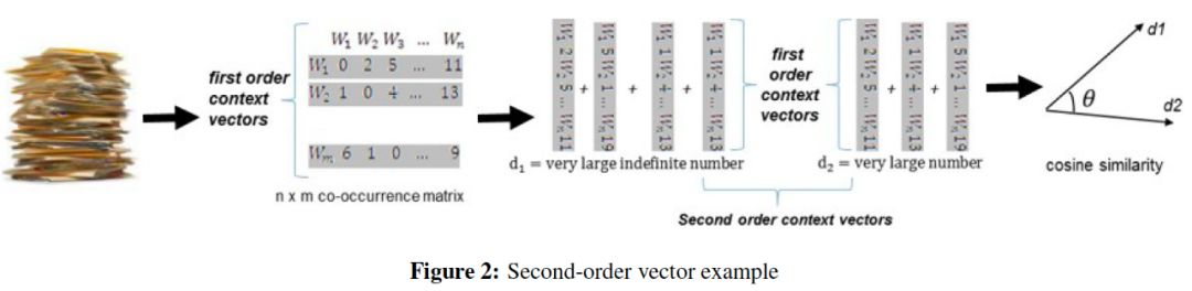 一阶向量由候选集与新实体定义中关联单词出现的次数构成,利用余弦相似性来量化相似程度。但缺点是向量矩阵过于稀疏。因此在二阶向量度量中,为定义中的每个单词创建一个向量,其中包含其在外部语料库中共现的单词,将词向量平均值作为新实体和候选集的二阶向量。