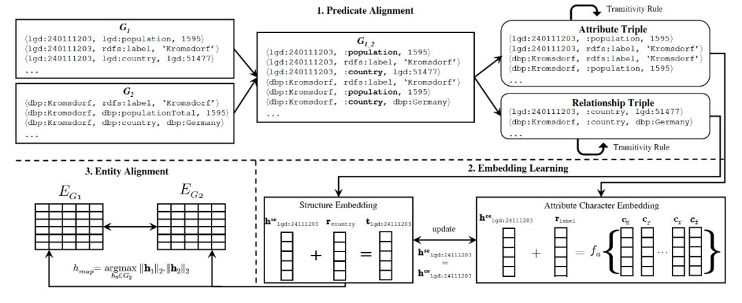 不同于TranE和PTransE等模型,学习实体或者路径,本文还考虑了图谱中的实体属性值,进一步丰富了实体的语义环境。算法分为三个部分:谓词对齐、知识表示学习和实体对齐。