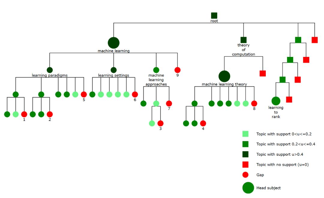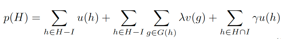惩罚函数主要由三个部分组成:head subjects, gaps,offshoots。其中head subjects代表模糊子集最终对应到图谱中的中间节点(概念节点),gaps代表可以被插入的位置,offshoots代表应该在head subjects下但插入到错误未位置的叶子节点。通过Parsimonious Generalization of Fuzzy Sets算法,得到模糊子集H。通过对head subjects, gaps,offshoots最小化,将模糊子集正确的融合进已有图谱,并保证图谱结构的整体准确性。