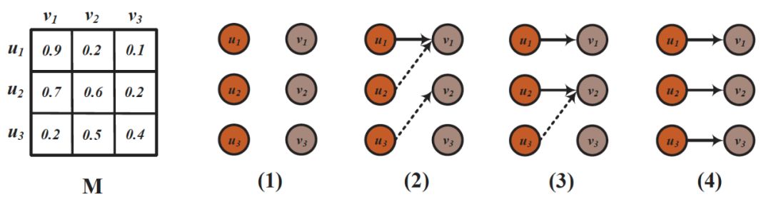 假设有三个源实体u1,u2,u3和三个目标实体v1,v2,v3。给定融合相似度矩阵M,其中实体对应行/列中的值表示其偏好(首选较大的值)。源实体按照偏好矩阵,依次向目标实体进行对齐。