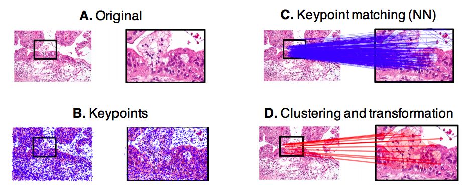 检测复制-移动重用。A.癌变细胞和缩小部分的原始例子。B.关键点(高熵区域)的计算C.最近邻匹配。D.集群关键点、跨集群匹配和仿射变换。