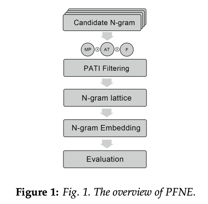 为了解决这一问题,作者提出了一种新的无分词的词嵌入模型 PATI Filtered N-gram Embedding(PFNE),整体流程如下: