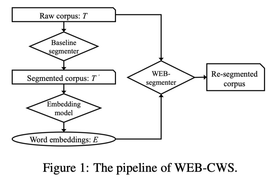 基于以上假设,作者提出了一种基于 word-embedding 的半监督分词方法——WEB-CWS(Word-Embedding-Based CWS),该方法还可以实现 cross-domain 的分词。