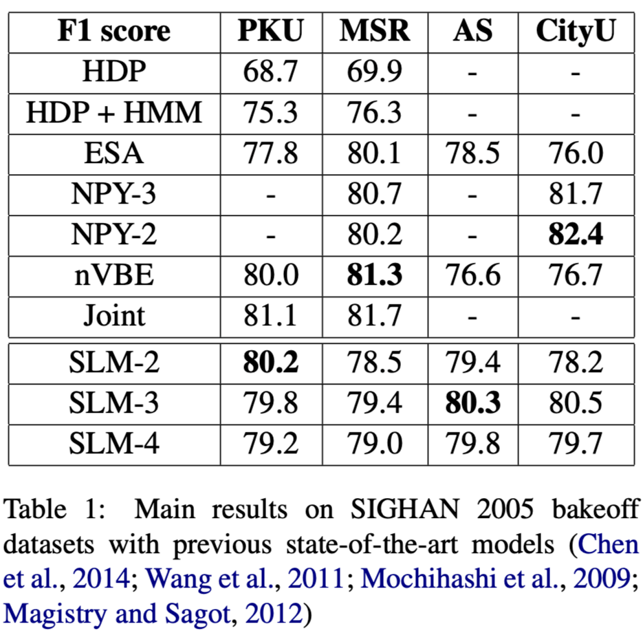 从表 1 可以看出,SLMs 在 PKU 和 AS 数据集上优于以往最好的判别和生成模型。这可能是由于 SLM 模型的分割准则更接近这两个数据集(模型名称后面的数字表示的是最大切分长度)。