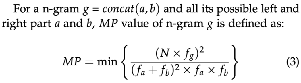给定一个固定长度 s 的 n-gram g = concat(a, b),总存在使 MP 最小化的 n-gram 段