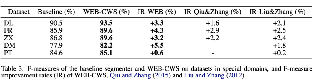 上表的结果表明,作者提出的的 WEB-CWS 模型可以明显改善特定领域的四个数据集的 CWS,包括 DL、FR、ZX 和 DM,在F值上提高了 3.0% 以上。这一结果表明 WEB-CWS 能够有效地改善跨域 CWS。