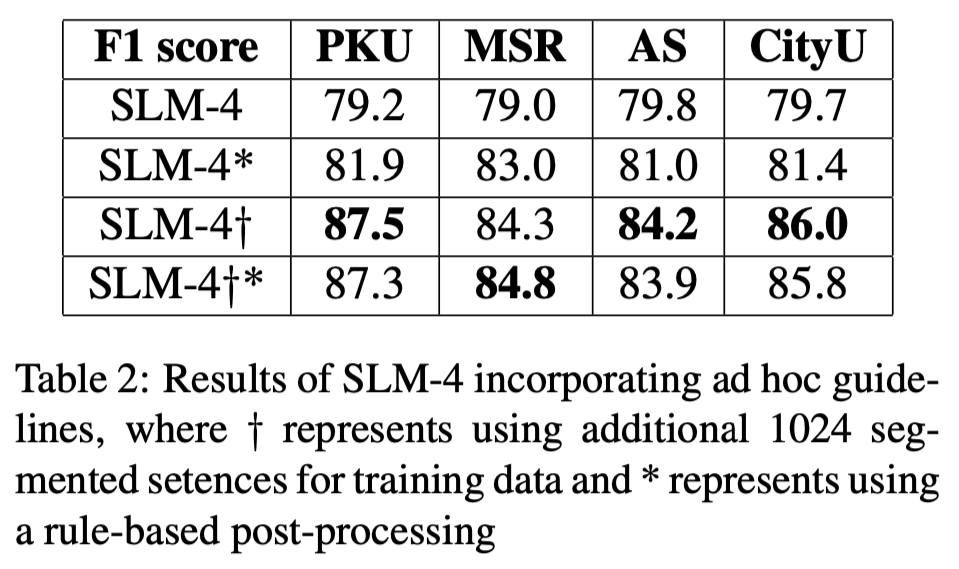 此外作者还发现在中文中,“的”经常跟在形容词之后,“了”经常跟在动词之后。因此,作者提出一个后处理模块来处理这个问题。此外,作者还利用分割后的训练数据集的前 1024 句对来弱监督训练“SLM-4”,并进行了评价。