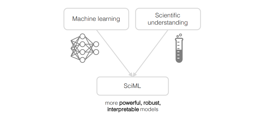 图1.1:科学机器学习(SciML)概述。SciML旨在将ML与科学知识紧密结合,以便为科学研究生成更强大、鲁棒和可解释的ML方法。
