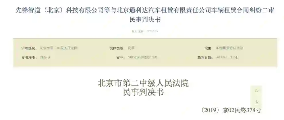 在北京法院审判信息网上,1月24日,铅笔道看到先锋智道(北京)科技有限公司即AA租车,与北京通利达汽车租赁有限责任公司的判决书提到,先锋智道因提前结束了租赁,对方要求赔偿一定损失,双方产生了纠纷。