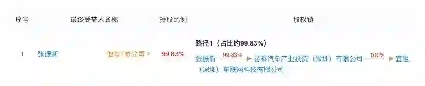 值得注意的是,在股权关系上,铅笔道注意到宜租租车的实际控制人为张振新,而先锋集团董事长也叫张振新。