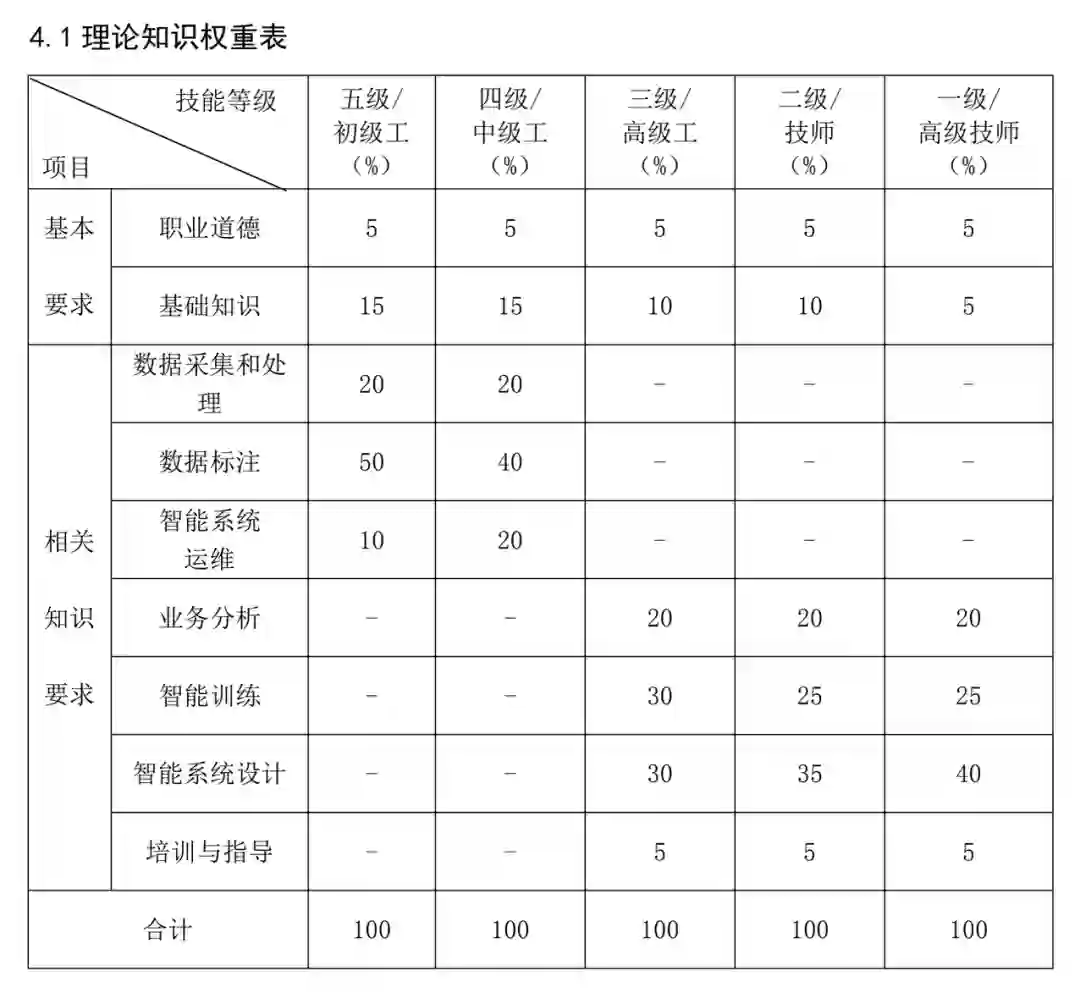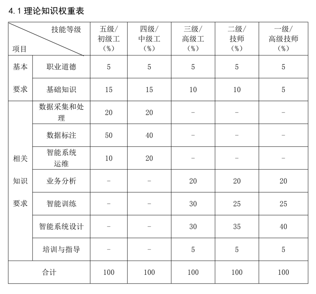 在理论知识考试中,不同技能等级在理论知识上的要求是不同的,五级和四级制涵盖「数据采集和处理」、「数据标注」、「智能系统运维」,三级及以上则涵盖「业务分析」、「智能训练」、「智能系统设计」、「培训与指导」。