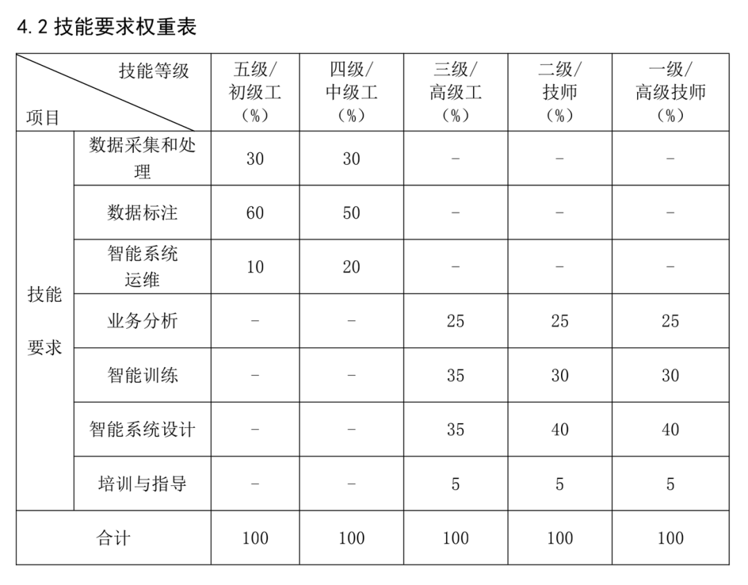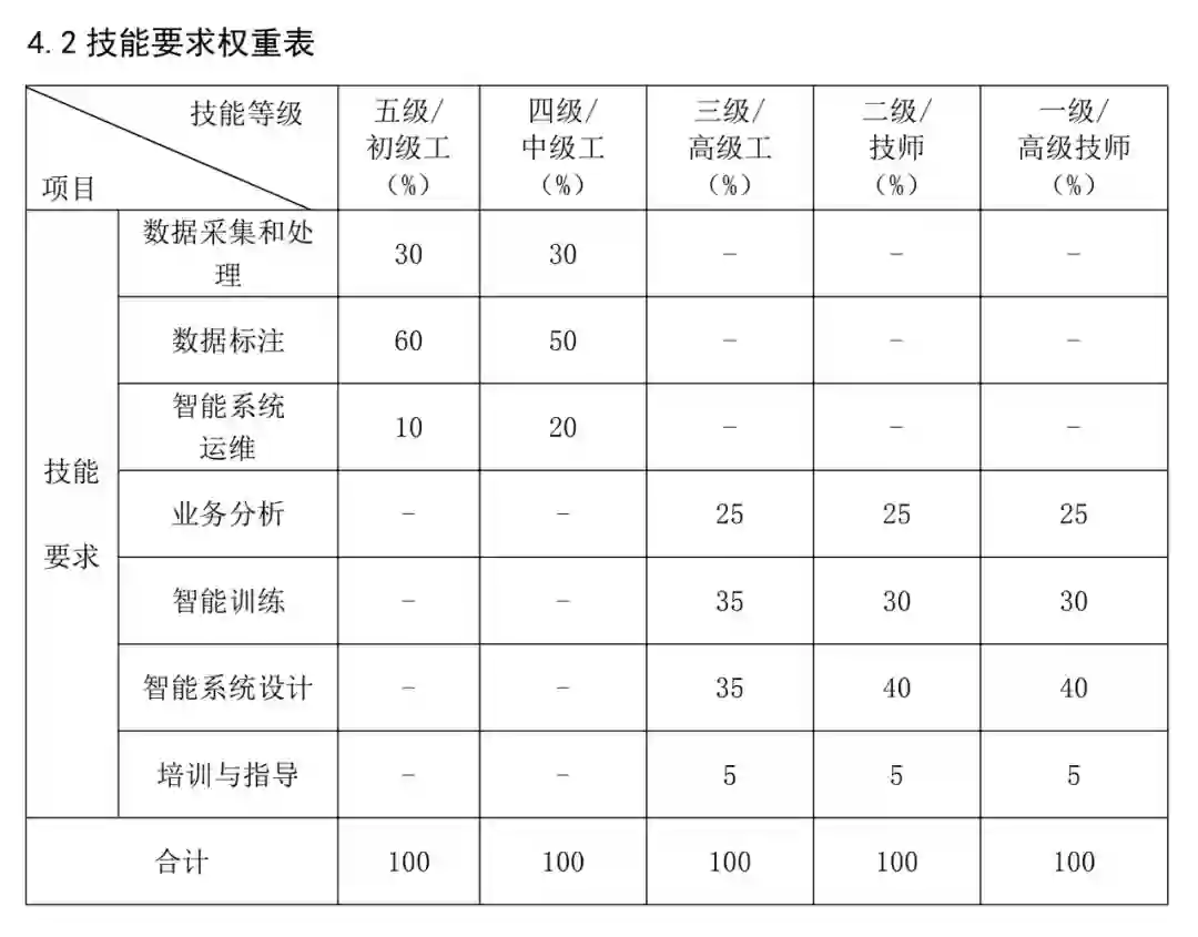 从「五级 / 初级工」到「一级 / 高级技师」,人工智能训练师的职业技能要求依次递进。