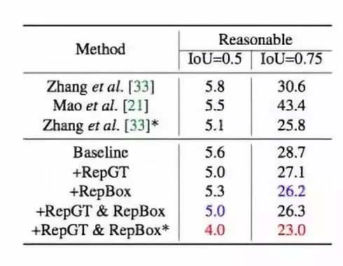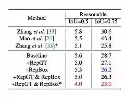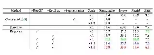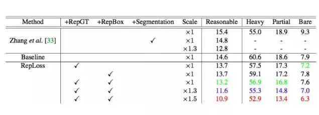 表 3:在 CityPersons 上评估的 RepLoss 行人检测结果。模型在训练集上训练,并在验证集上测试。ResNet-50 是 backbone。最佳的 3 个结果分别标为红、蓝、绿色。