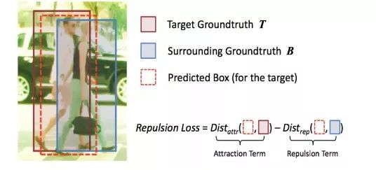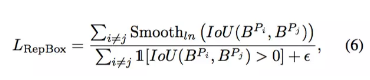 NMS 是绝大多数检测框架中不可或缺的后处理步骤,为降低检测器对 NMS 的敏感度,作者接着提出 RepBox 损失,意在排斥来自不同指定目标的 proposal。RepBox 损失可计算为: