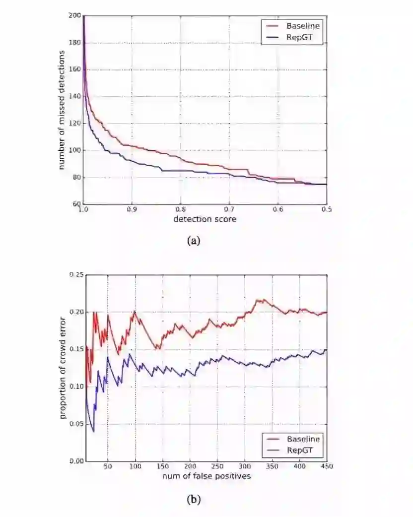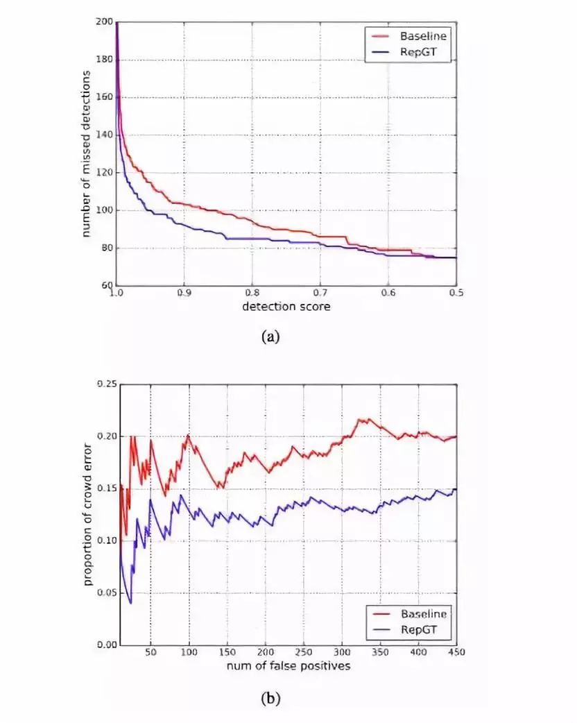 图 3(a) 是不同检测分值下在 reasonable-crowd 子集上的漏检数量,红线表示基线的 groundtruth 行人漏检数量。在现实应用中,只考虑带有高置信度的预测边界框,曲线左端的高漏检量意味着离实际应用还很远。图 3(b) 表示由密集遮挡导致的误检占全部误检的比例,红线表明基线的这一比例大概在 20% 左右。如图 3 红、蓝线对比所示,RepGT 损失分别有效降低了由密集遮挡造成的漏检和误检数量。