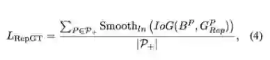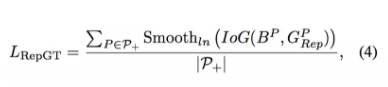 RepGT 损失旨在使 proposal 受到相邻的非目标 groundtruth 物体的排斥。给定一个 proposal P ∈ P_+,它的排斥 groundtruth 物体被定义为除了其指定目标之外带有最大 IoU 区域的 groundtruth 物体。受 IoU 损失的启发,RepGT 损失被计算以惩罚 B^P 和 G^P_Rep 之间的重叠(由 IoG 定义)。IoG(B, G) ∈ [0, 1],从而 RepGT 损失可写为: