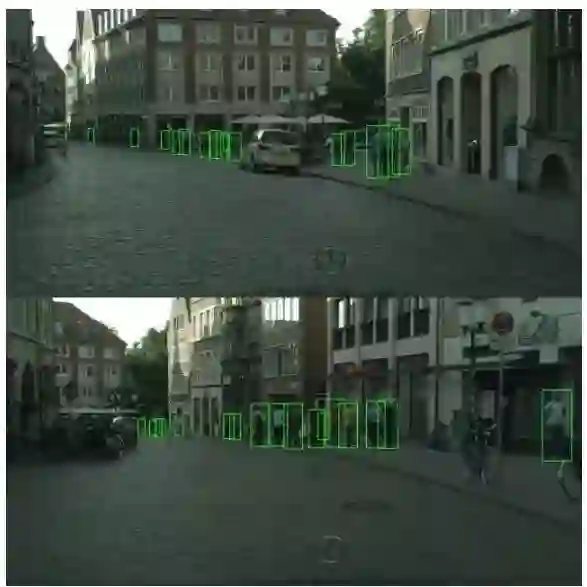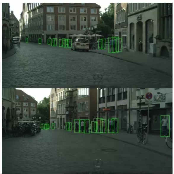 图 10:更多的 CityPersons 数据集检测实例。绿框中是预测的行人,其分值 ([0, 1.0]) 大于 0.8。